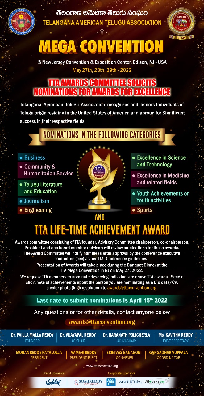 We request TTA members to nominate deserving individuals to above TTA awards. Send a short note and achievements about the person you are nominating as a Bio data/CV, a color photo (high resolution) to awards@ttaconvention.org. Last date to submit nominations is April 15th, 2022.