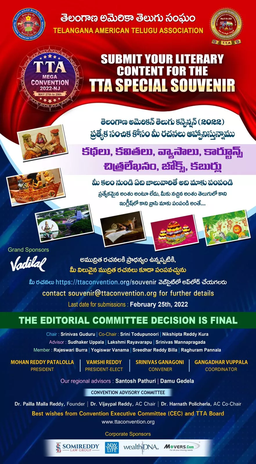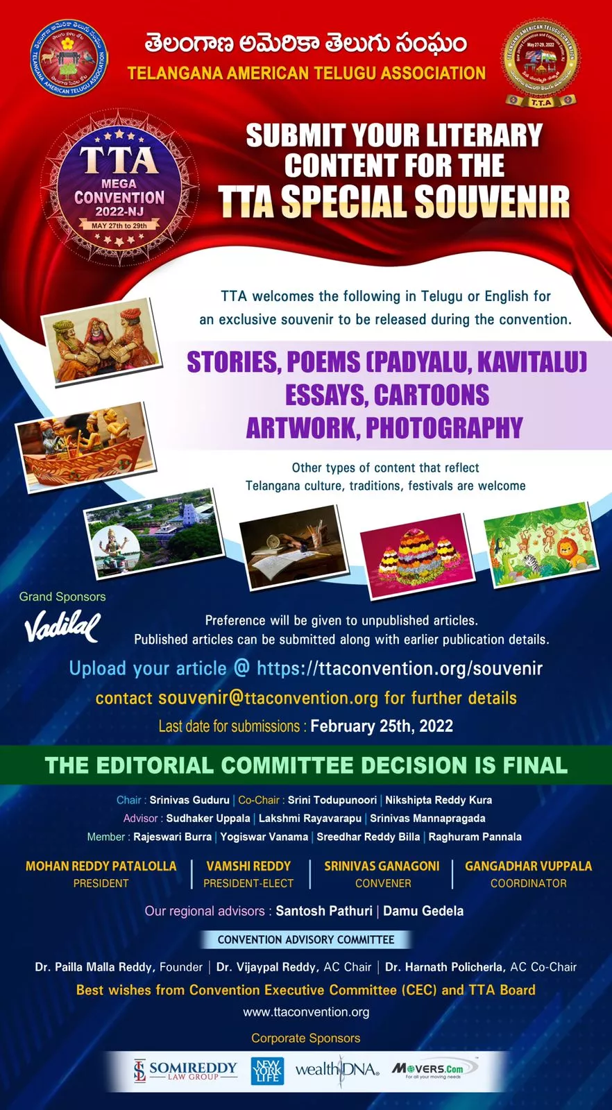 TTA (Telangana American Telugu Association) will be releasing a Convention Special Souvenir during the convention in May 2022. TTA requests all writers to send the following articles in Telugu or English for consideration.
